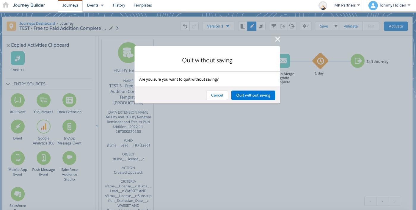 In addition, there have been some form of inconsistencies where changing the “Entry Event” off of a copied track could stem back to the Journey Track initially used for duplication. See below for how “TEST 4 — Free to Paid Addition Complete Template (PRODUCTION)” replaces the original naming convention within the copied Journey “Free to Paid Addition Complete Template (PRODUCTION).” This is troublesome, as there isn’t any warning to know when any of these changes can occur. Furthermore, it’s bizarre how changes made to a copied Journey Track can flip back and change up the original in terms of entry settings. Bottom Line: Be careful and consider building out new Journey’s from scratch as the copying mechanism seemingly hasn’t reached prime-time just yet: