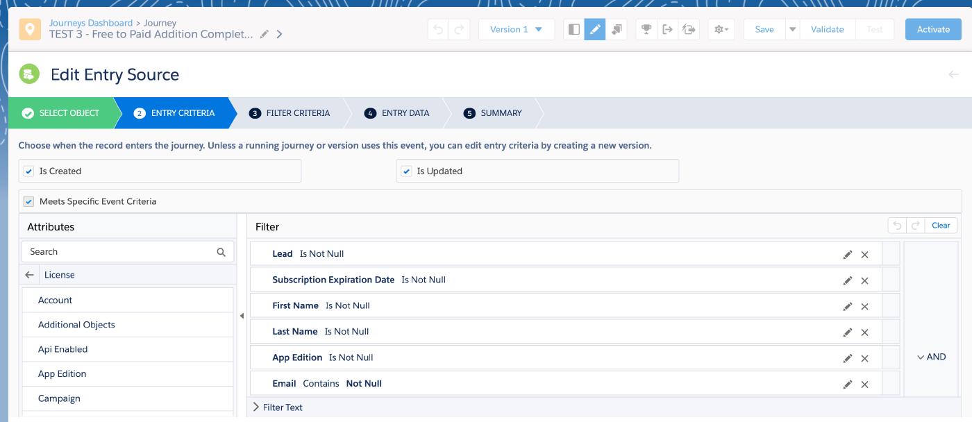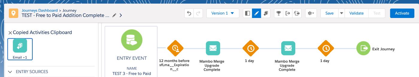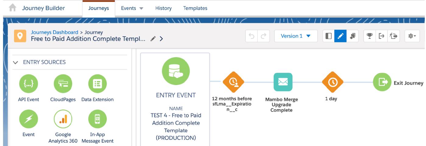 **2. Watch Out for “Entry Events” When Copying a Journey Track:**This is a real “Gotcha” in Journey Builder. If an end-user performs multiple copies of a Journey Track, some programmed “Entry Event” values don’t pull — rather, they simply stay static to the initial criteria within the first addition. You can see an example of this scenario below, utilizing “TEST 2 — Free to Paid Addition Complete Template (PRODUCTION)” as a copy to “TEST 3 — Free to Paid Addition Complete Template (PRODUCTION)”: