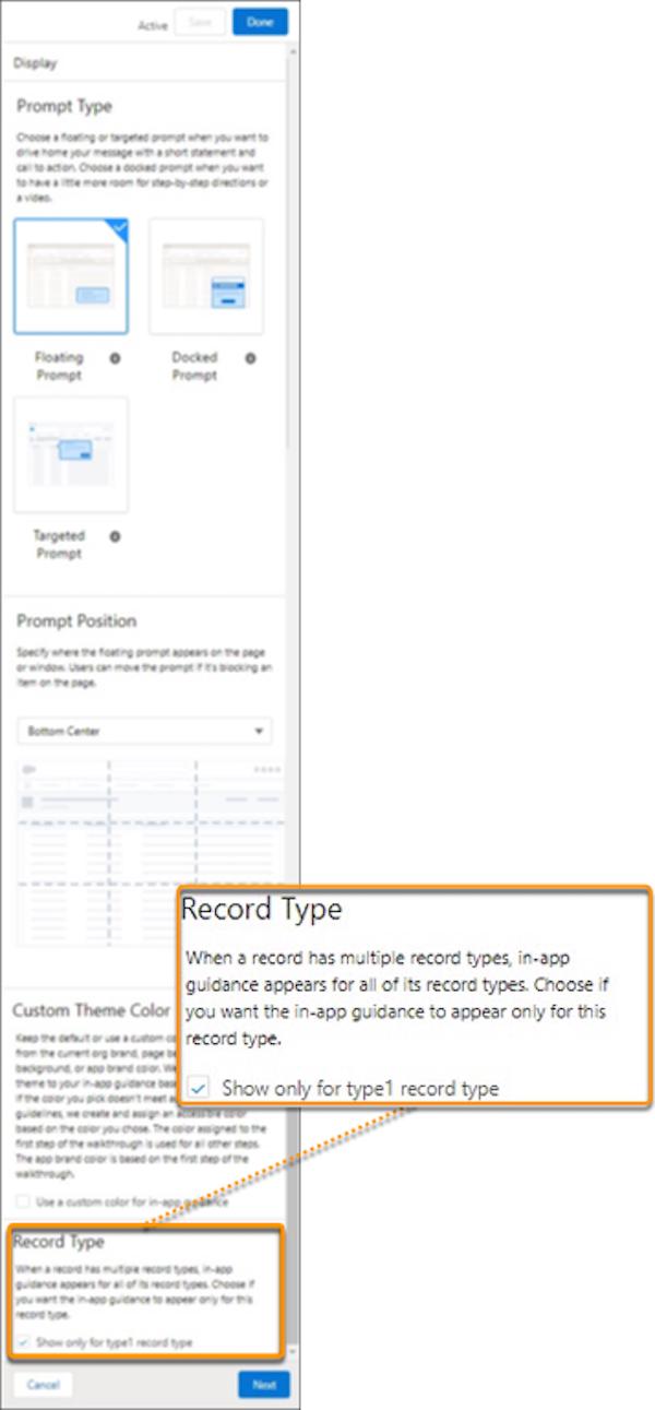 Previously, when you created in-app guidance and assigned it to a record page with multiple record types, the in-app guidance appeared for all of its record types. That meant for rarer use cases, admins had to choose whether their users should be hindered by a rarely relevant prompt (which they’d learn to quickly ignore and close) or, to leave users guidance-less — meaning when it came time to process an outlier, they might be lost.
